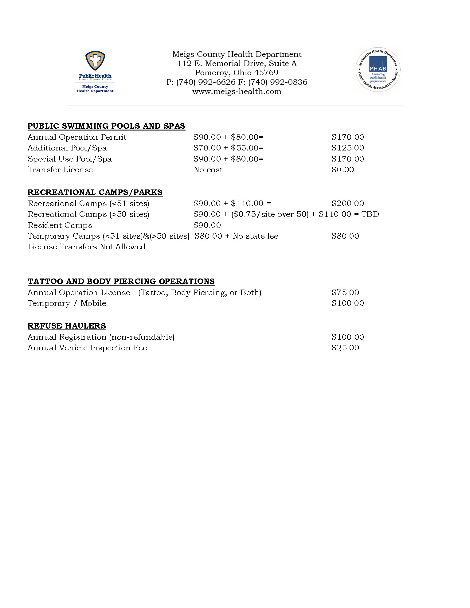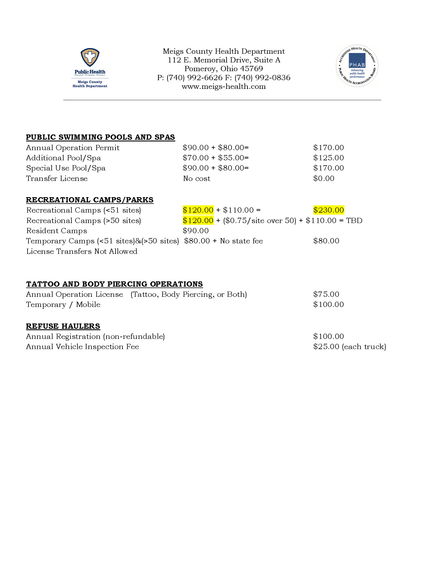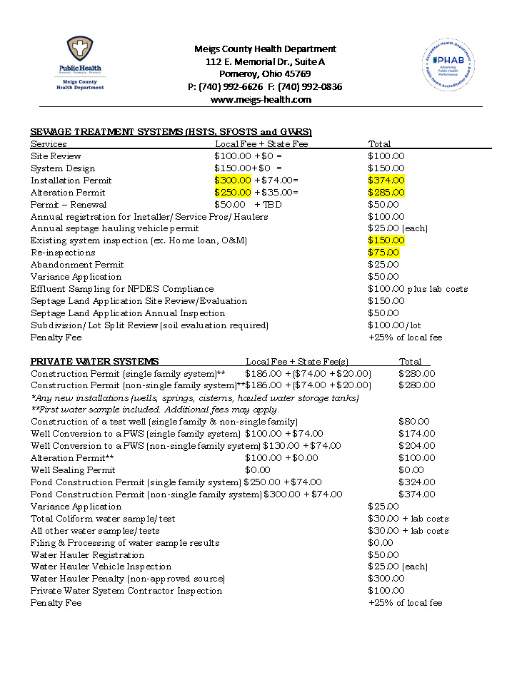 2025 Proposed Environmental Health Fees (Click for PDF Copy)