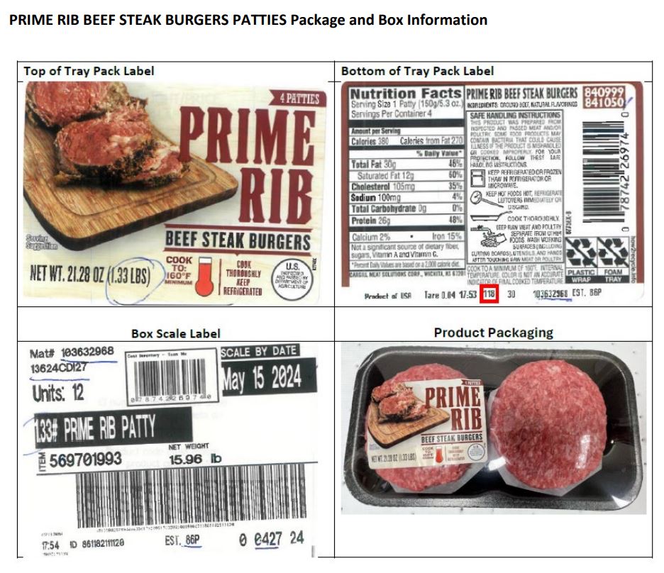 - 1.33-lbs. plastic-wrapped trays containing four “PRIME RIB BEEF STEAK BURGERS PATTIES” with lot code 118 and establishment number “EST. 86P” printed on the back of the label.