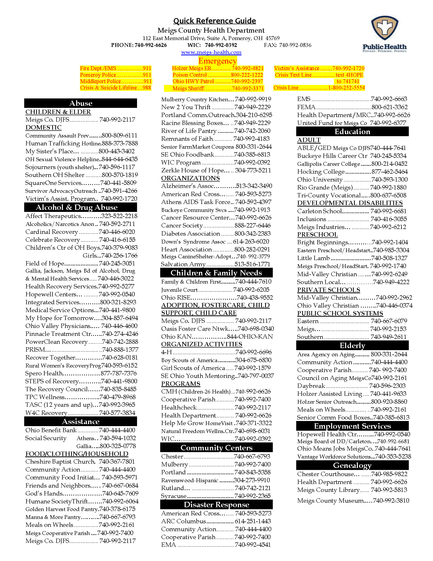 The Meigs County Health Department announces the availability of the RURAL HEALTH CARE ACCESS: RESEARCH REPORT produced by Dr. Michele Morrone, Director of Ohio University’s Appalachian Rural Health Institute at Ohio University and her team. The report summarizes survey results that include responses of many Meigs County residents about Appalachian health needs, issues, and disparities. Thanks to all who participated in the survey!