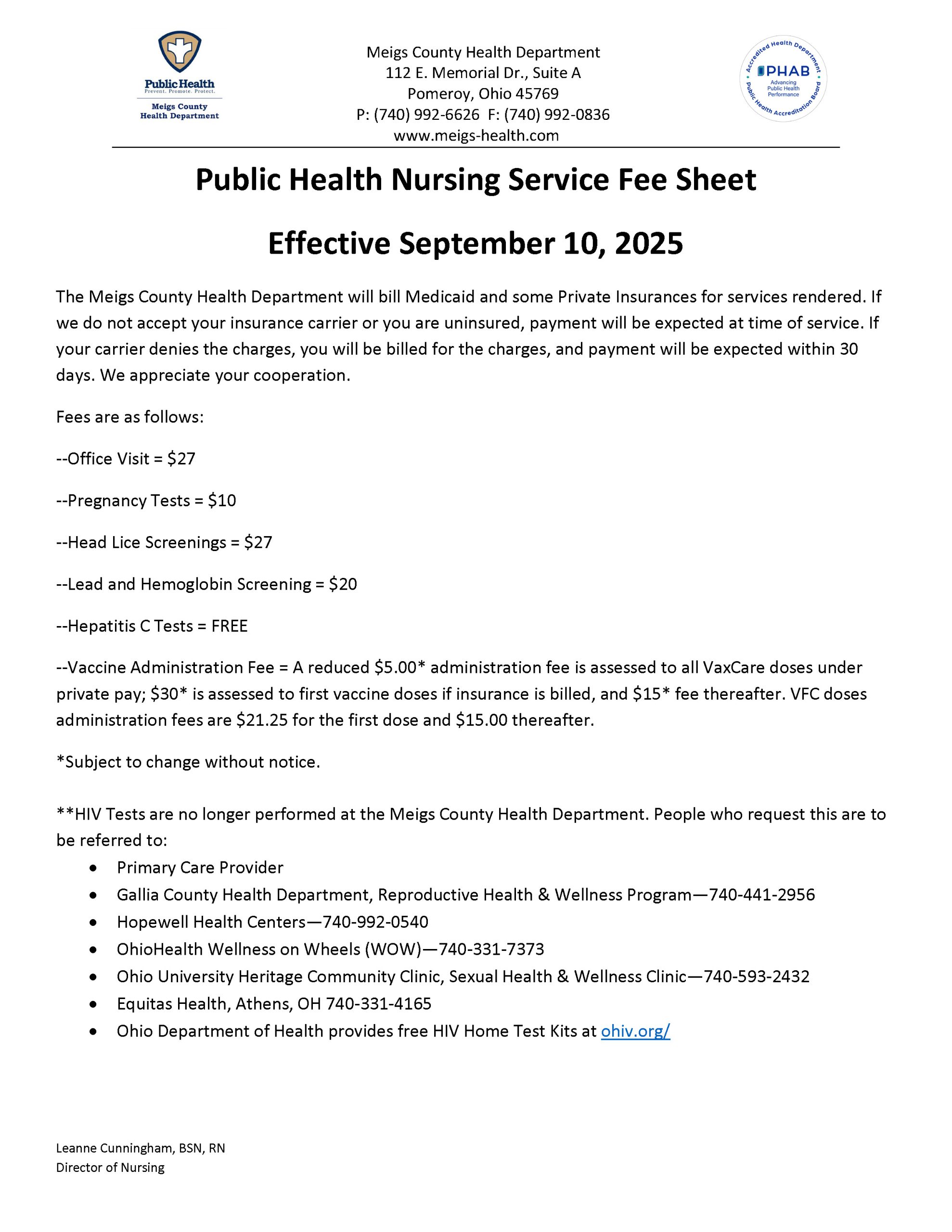 The Meigs County Health Department will bill Medicaid and some Private Insurances for services rendered. If we do not accept your insurance carrier or you are uninsured, payment will be expected at time of service. If your carrier denies the charges, you will be billed for the charges, and payment will be expected within 30 days. We appreciate your cooperation.